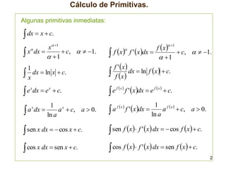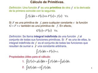 El documento presenta una definición y propiedades sobre el cálculo de primitivas. Explica que una función F es primitiva de otra f si la derivada de F es igual a f. Luego, detalla algunas primitivas inmediatas como la integral de funciones exponenciales, logarítmicas, trigonométricas y racionales.