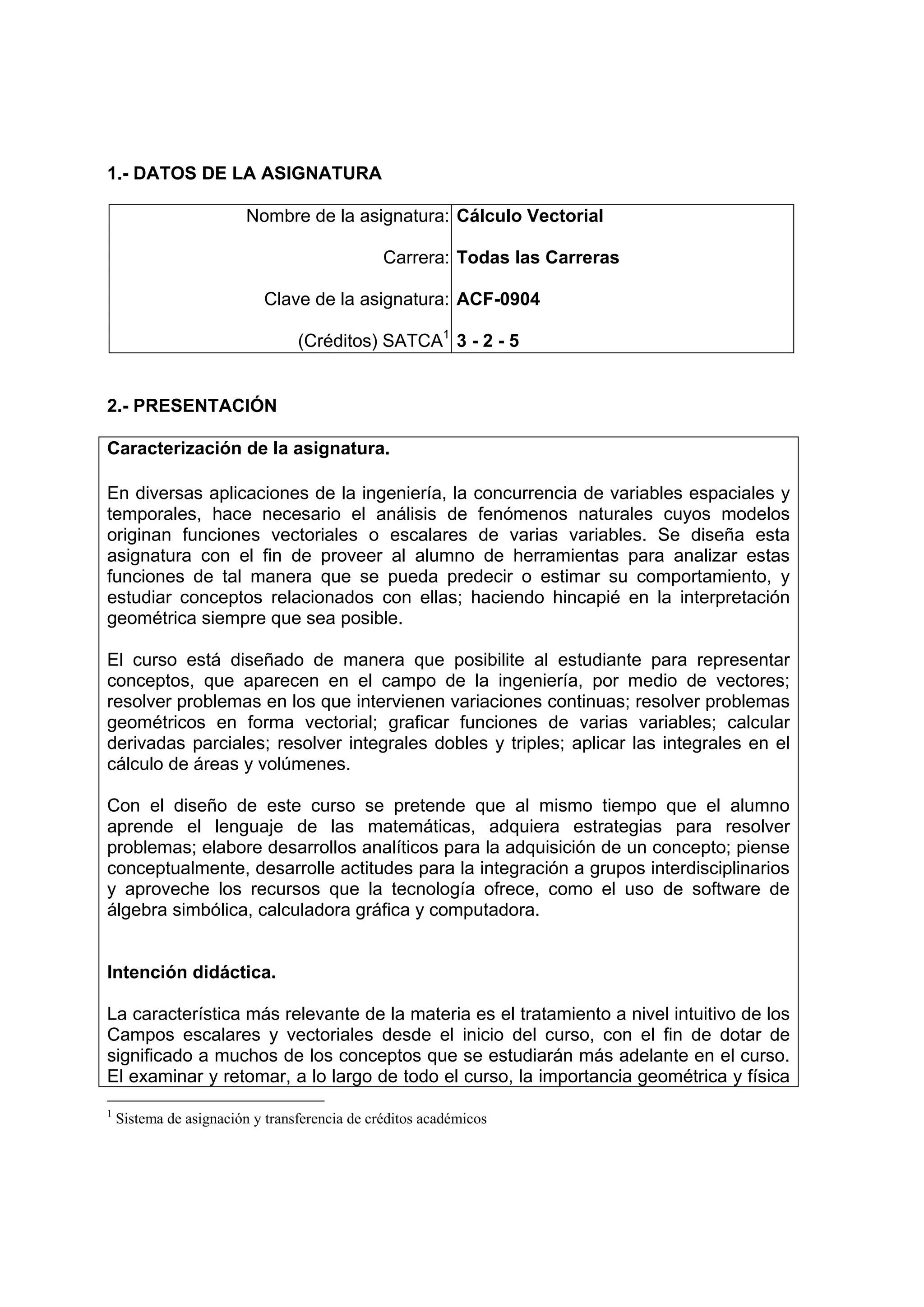 Este documento presenta la asignatura de Cálculo Vectorial. Incluye información sobre el nombre de la asignatura, créditos, objetivos, competencias a desarrollar, temario con cinco unidades y sugerencias didácticas para promover el aprendizaje activo. El propósito principal es que los estudiantes aprendan los principios básicos del cálculo en varias variables para interpretar y resolver modelos matemáticos.