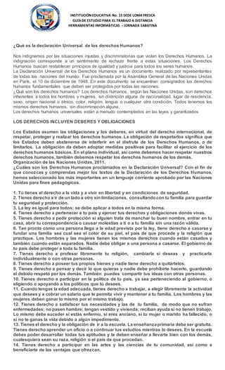 Este documento presenta una guía de estudio sobre los derechos humanos. Explica que todos los seres humanos tienen derechos inherentes e inalienables. Resume la Declaración Universal de los Derechos Humanos de 1948 y enumera algunos de los derechos fundamentales que proclama, como el derecho a la vida, la libertad, la seguridad, la propiedad, la educación, el trabajo y la no discriminación. También destaca que los derechos conllevan deberes y responsabilidades tanto para los individuos como para los estados.