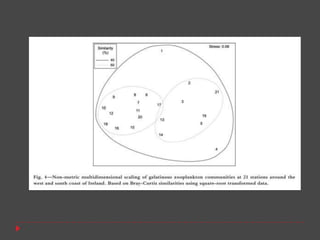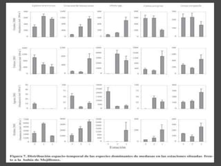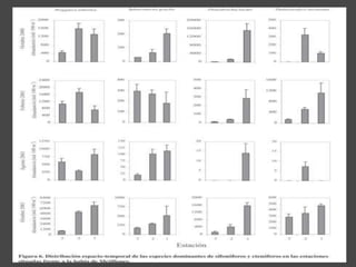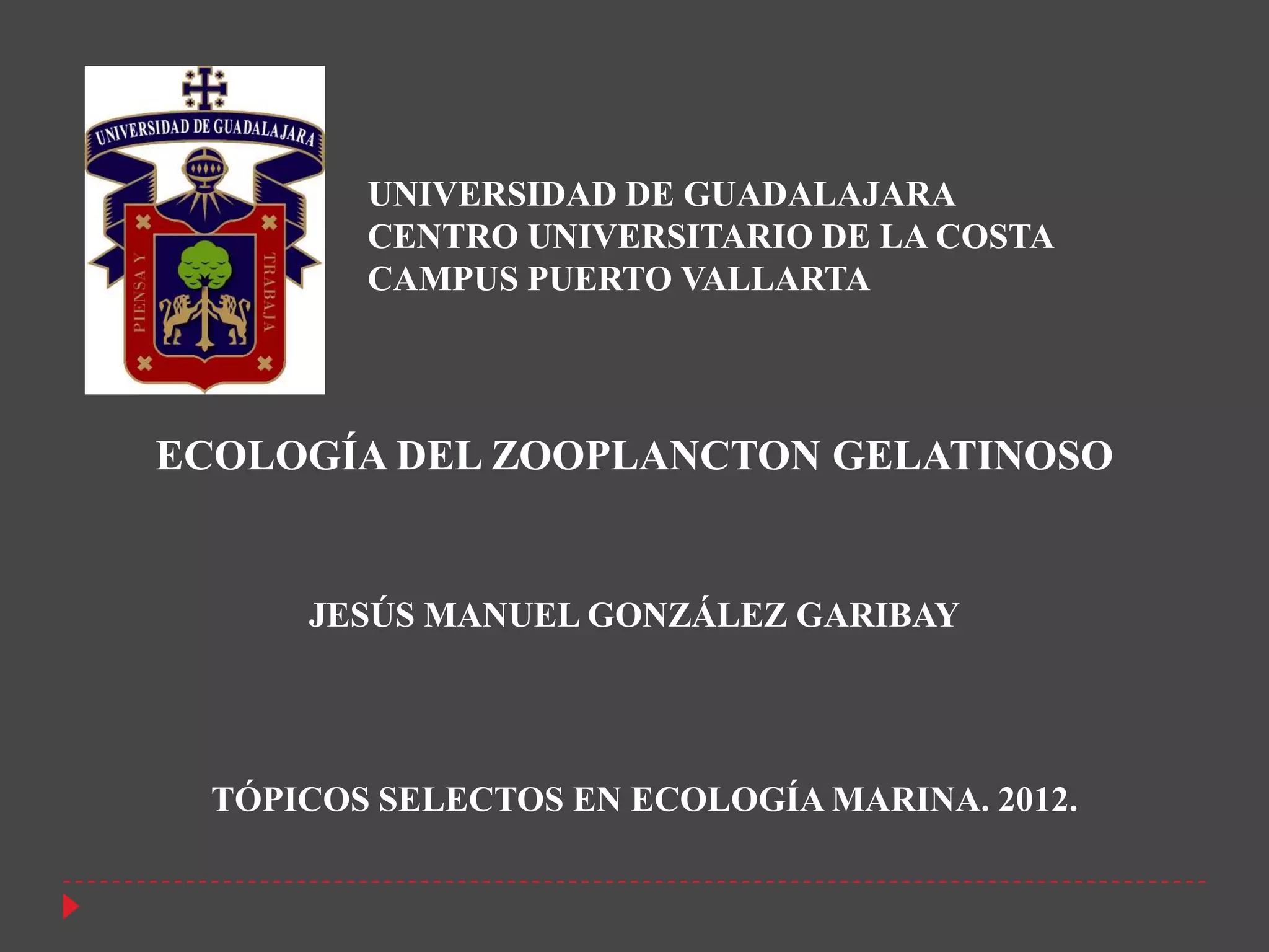 Este documento resume un estudio sobre la abundancia, distribución y composición de la comunidad del zooplancton gelatinoso carnívoro en una zona de surgencia costera en el norte de Chile. Se identificaron 44 especies de medusas, sifonóforos y ctenóforos. Se encontró que la abundancia es mayor en primavera y verano, y menor en invierno, y que la mayoría de las especies se concentran en los primeros 100 metros de la columna de agua, especialmente en los primeros 25-50 metros. La distribución vertical