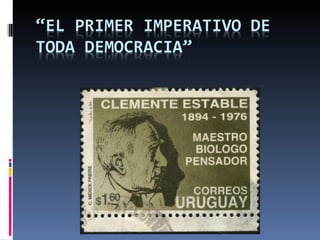 El documento resume la vida y pensamiento del pedagogo uruguayo Clemente Estable. Destaca que Estable creía que la educación debía servir para desarrollar la vocación de cada persona y lograr la superiorización de la vida a través de la cultura. También resalta que Estable veía a la educación como elemento fundamental para el buen desarrollo de la democracia y la igualdad de oportunidades.