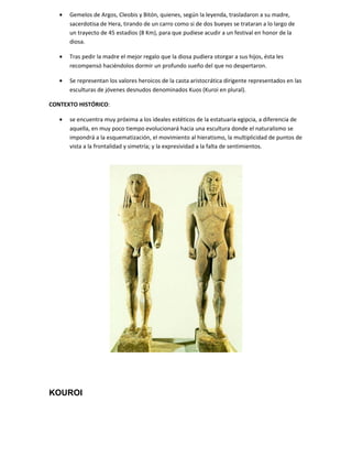 Las esculturas representan a los gemelos legendarios Cleobis y Bitón. Datadas entre 610-580 a.C., muestran a los dos jóvenes desnudos de pie de forma simétrica y frontal, con características propias del estilo arcaico como la rigidez de posturas y ausencia de emociones. Fueron halladas en Delfos y representan valores heroicos de la época a través del modelo de la estatuaria joven desnuda o kouros.