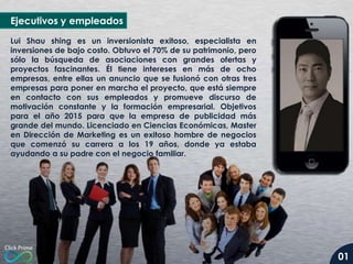 El documento presenta un modelo de negocio en la industria de la publicidad, liderado por Lui Shau Shing, que ofrece un enfoque innovador y variado en servicios de marketing digital y comercio electrónico. A través de diferentes paquetes de inversión, los clientes pueden acceder a múltiples oportunidades de ingresos y formación, además de un sistema de bonos por referral y ventas. La empresa también planea una asociación con universidades para cursos de formación y tiene proyecciones ambiciosas para convertirse en una de las mayores agencias de publicidad del mundo.