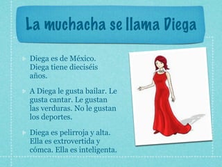 El documento presenta información sobre cuatro jóvenes de diferentes países: Diega de México, Carmelita de Chile, Eduardo de Panamá y Pedro de Argentina. Para cada persona, se proporciona su nombre, país de origen, edad, sus intereses y características físicas y de personalidad.