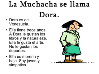 El documento presenta información sobre cuatro personas: Dora de Venezuela de 13 años que le gusta la lectura y la naturaleza; Ricardo de México de 18 años que le gusta leer y la escuela; Isabella de Puerto Rico de 10 años que le gusta leer, cantar, bailar y viajar; y Rico de Cuba de 15 años que le gustan los animales, el helado de chocolate y la naturaleza.
