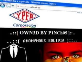 El documento habla sobre los ataques del lado del cliente, explicando que existen cuatro tipos principales: formatos de archivo, web, código móvil e ingeniería social. Describe brevemente cada tipo de ataque, incluyendo ejemplos como clickjacking en Facebook, el gusano Conficker y el gusano Morto. Finalmente, menciona algunos casos de ataques del lado del cliente contra organizaciones como Google, RSA y la CIA, y pregunta si hay alguna pregunta.