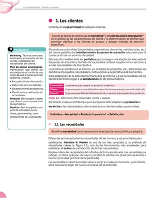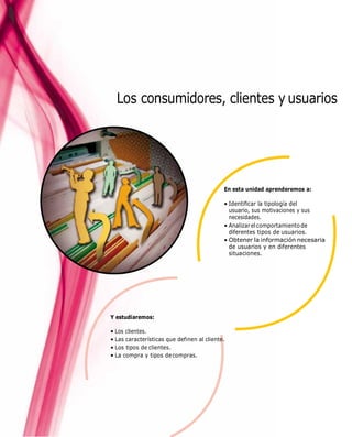 Este documento habla sobre los consumidores, clientes y usuarios. Explica que se analizarán las características y tipos de clientes, así como los factores que influyen en las compras. También define conceptos como consumidor, cliente y usuario, y describe la pirámide de necesidades de Maslow. Finalmente, clasifica los tipos de clientes y compras.