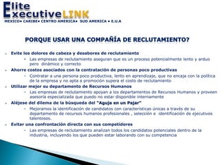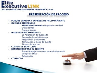 Este documento proporciona información sobre los servicios de reclutamiento de Elite Executive Link. Explica por qué las empresas deberían usar sus servicios de reclutamiento, cómo se diferencian de otros proveedores, su procedimiento de reclutamiento en 5 etapas, los costos, los beneficios para los clientes y datos de contacto.