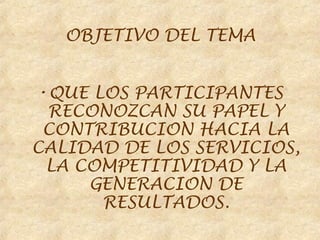 Este documento describe la importancia de la relación entre clientes y proveedores para mejorar la calidad de los servicios. Explica que los clientes buscan valores como calidad, seguridad y procesos completos, mientras que los proveedores deben definir especificaciones, producir el servicio y supervisarlo preventivamente. También enfatiza la necesidad de medir las necesidades de los clientes para mejorar continuamente los servicios.