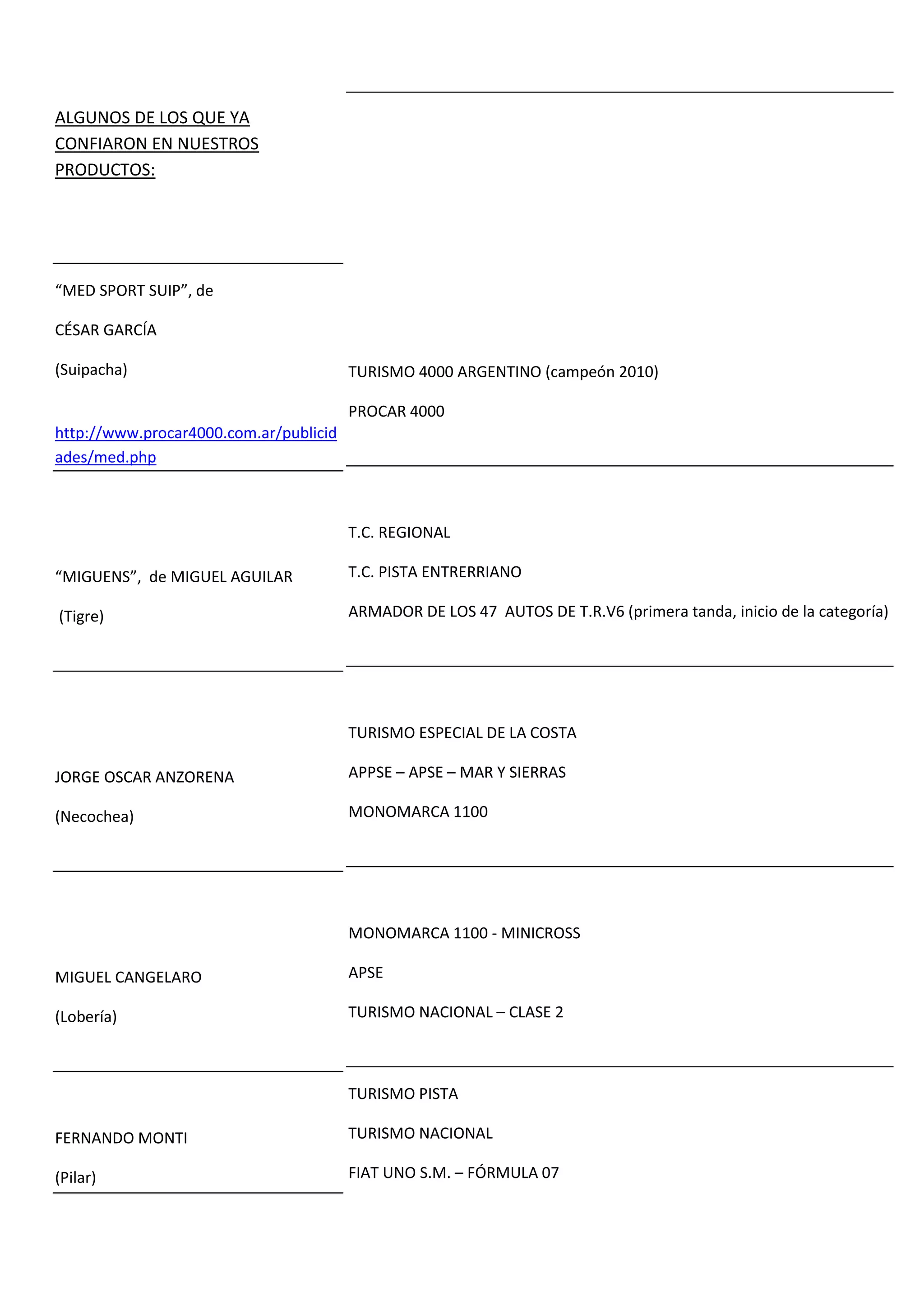 El documento lista los nombres de varios clientes que han confiado en los productos de Procar 4000, una compañía argentina. Entre los clientes se encuentran pilotos y equipos de carreras de Turismo 4000 Argentino, TC Regional, TC Pista Entrerriano, Turismo Especial de la Costa, Monomarca 1100, APSE, Turismo Nacional y Fiat Uno S.M.