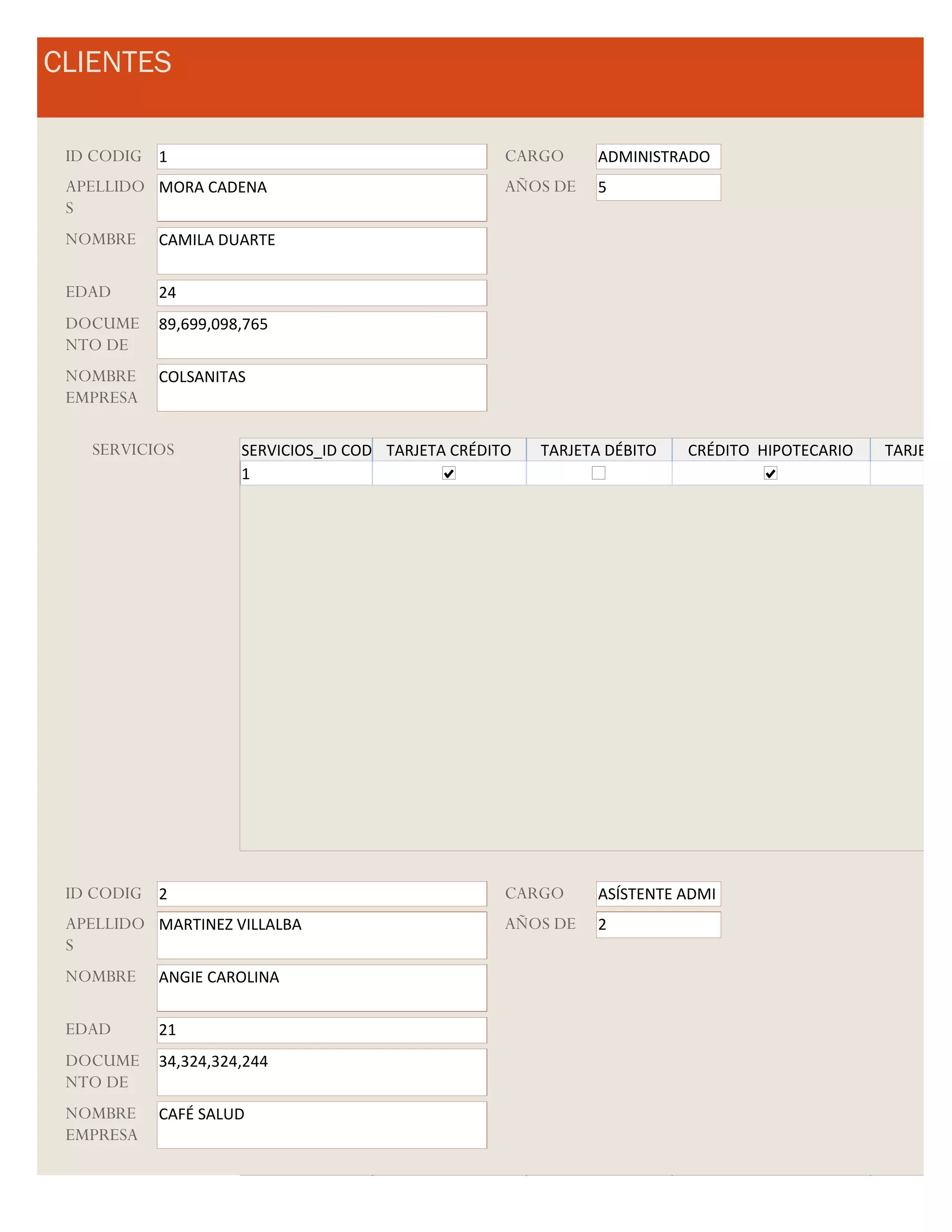 El documento presenta información de 20 clientes que incluye su nombre, apellido, edad, documento de identidad, empresa donde trabajan, cargo, años de experiencia y los servicios bancarios de los que son clientes como tarjetas de crédito, débito y créditos hipotecarios.
