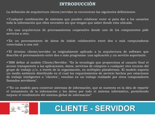 Este documento describe la arquitectura cliente-servidor. Define los elementos principales como el cliente y el servidor, y explica que el cliente solicita servicios del servidor. También describe la evolución de esta arquitectura desde las computadoras centrales hasta la era actual de redes distribuidas. Finalmente, cubre temas como los tipos de clientes y servidores, las características del modelo cliente-servidor y los estilos de presentación distribuida, remota y lógica distribuida.