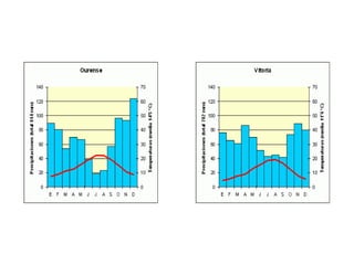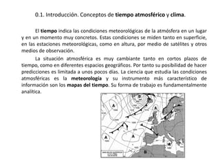 Este documento describe los factores que contribuyen a la diversidad climática de España, incluyendo factores geográficos como la latitud, la altitud y la proximidad al mar, y factores dinámicos como los centros de acción atmosféricos y los frentes. Se analizan los diferentes tipos de clima en España como los climas atlánticos, mediterráneos, de montaña y de Canarias. También se explican conceptos climáticos como las isotermas, isoyetas y diagramas ombrotérmicos que se us