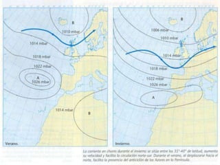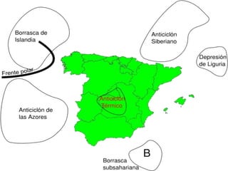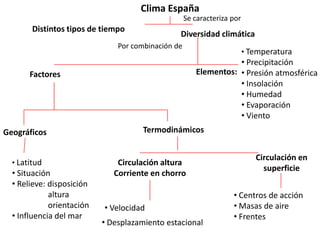 El documento resume los principales factores y elementos que afectan al clima de España, incluyendo la temperatura, precipitación, presión atmosférica, insolación, humedad, evaporación y viento. Explica la diversidad climática de España debido a la combinación de factores geográficos como la latitud, relieve y proximidad al mar, así como factores termodinámicos como la circulación atmosférica en altura y en superficie.
