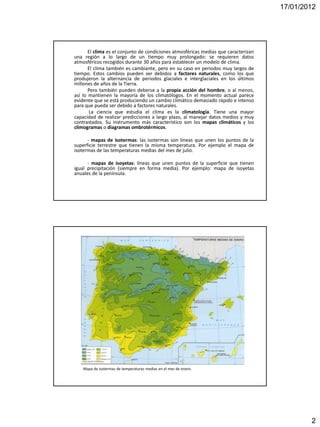 Este documento describe los factores que influyen en la diversidad climática de España, incluyendo factores geográficos como la latitud, la proximidad al mar y el relieve, y factores dinámicos como los centros de acción atmosféricos y los frentes. Explica conceptos como isobaras, anticiclones, frentes cálidos y frentes fríos. También analiza cómo estos factores afectan específicamente al clima de la península ibérica y de Castilla y León.