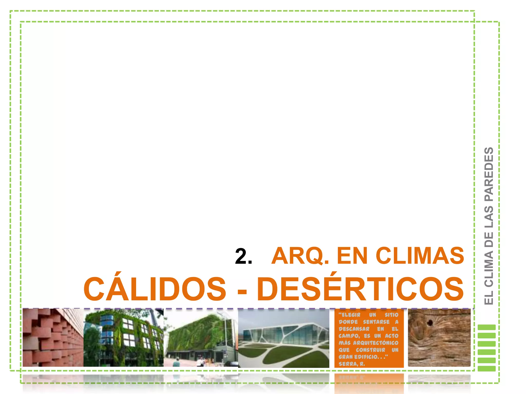 El documento describe las características climáticas de los desiertos y cómo la arquitectura tradicional ha respondido de manera sensible al clima a través de técnicas pasivas como muros gruesos y espacios intermedios que proporcionan sombra y ventilación cruzada. Sin embargo, la arquitectura moderna en los desiertos a menudo depende excesivamente del aire acondicionado en lugar de aprovechar los principios de diseño climáticamente sensibles de la arquitectura vernácula.
