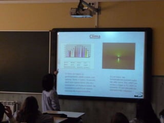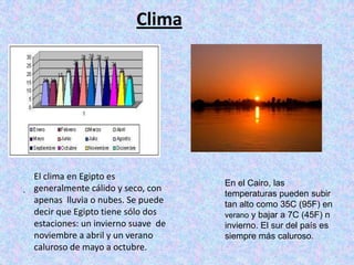 El documento describe brevemente el clima, la vegetación y la ubicación de Egipto. El clima es generalmente cálido y seco, con temperaturas que alcanzan los 35°C en verano y bajan a 7°C en invierno. La vegetación solo se encuentra a lo largo del río Nilo, donde crecen olivos, melocotoneros, hibiscos y jazmines. Egipto está ubicado en el noreste de África, limita al norte con el Mar Mediterráneo, al este con el Mar Rojo, al oeste con