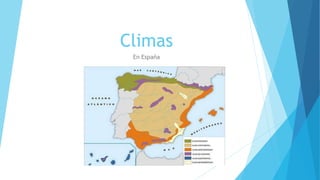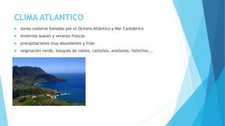 Este documento describe los principales climas de España, incluyendo el clima atlántico con inviernos suaves y veranos frescos, el clima continental con inviernos y veranos extremos, el clima de montaña con inviernos fríos y veranos lluviosos, y el clima de las Islas Canarias con temperaturas suaves todo el año. También explica brevemente el efecto invernadero natural y antropogénico y las posibles soluciones al calentamiento global como plantar árboles y usar energías renov