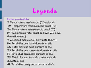 Este documento presenta una tabla y varios gráficos que muestran la evolución meteorológica en Santander, España desde 1973 hasta la actualidad. La tabla proporciona definiciones clave para interpretar los datos meteorológicos analizados en los gráficos, los cuales muestran tendencias en temperatura, precipitación, velocidad del viento, días de lluvia, nieve, tormentas y otros eventos a lo largo de los años. Los gráficos también establecen líneas rojas para indicar las medias de cada variable meteorológ