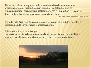 El documento define el clima como el efecto a largo plazo de factores como la temperatura, precipitación, radiación solar y vegetación que caracterizan una región. Explica que el clima se diferencia del tiempo meteorológico diario al ser una síntesis a largo plazo. También describe las escalas de macroclima, mesoclima y microclima y los factores como la temperatura, presión, vientos y precipitaciones que influyen en el clima de una región.