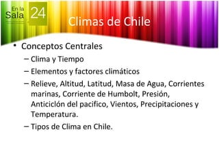 c) Los factores climáticos que explican estas temperaturas son la latitud (zona templada del hemisferio sur), la corriente de Humboldt que mantiene las temperaturas más altas en verano, y el anticiclón del Pacífico que genera tiempo seco.