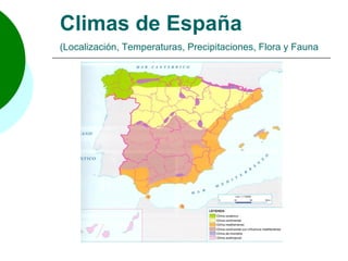 España tiene seis tipos principales de clima: oceánico, continental, mediterráneo, continental con influencia mediterránea, subtropical y de montaña. Cada clima se caracteriza por sus propias temperaturas, precipitaciones, flora y fauna. Los factores que influyen en el clima de una región incluyen la latitud, la altitud, las corrientes marinas y el relieve.