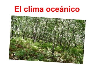 El documento describe los diferentes climas de España, incluyendo el clima oceánico, continental, mediterráneo, continental-mediterráneo, de montaña y subtropical. Cada clima se caracteriza por sus temperaturas, precipitaciones y vegetación típicas.