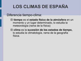 El documento describe los climas de España. Menciona que el clima se refiere a la sucesión del tiempo en un lugar, y es estudiado por la climatología. Luego describe los elementos del clima como la insolación, temperatura, humedad y precipitaciones, y explica cómo estos varían en diferentes regiones de España debido a factores geográficos como la latitud, proximidad al mar y relieve. Finalmente, analiza los tipos de masas de aire y frentes que afectan el clima español.