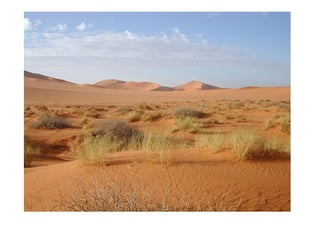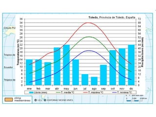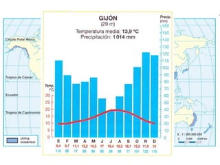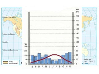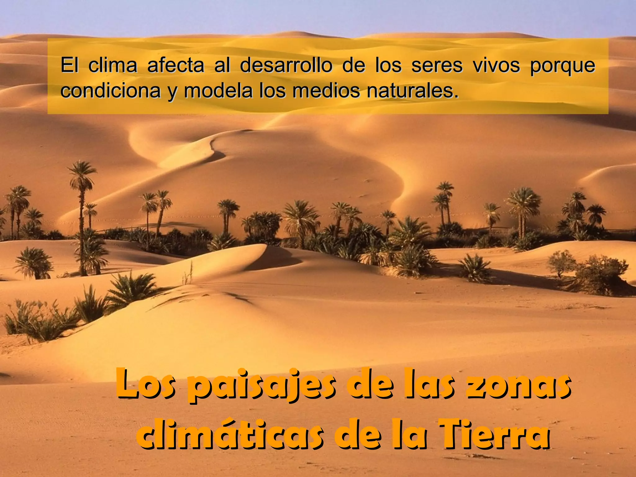 El documento describe cómo el clima afecta al desarrollo de los seres vivos a través de la condición y modelado de los medios naturales. Explica que factores como la latitud, altitud y proximidad al mar influyen en elementos climáticos como la temperatura y las precipitaciones, dando lugar a una gran diversidad de paisajes climáticos como los desérticos, polares y húmedos. Finalmente, señala que la Península Ibérica presenta variaciones climáticas debido a su latitud, distancia al mar y