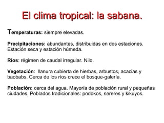 El documento describe los diferentes tipos de climas y sus características principales, incluyendo las temperaturas, precipitaciones, ríos, vegetación y población. Describe el clima ecuatorial de la selva, el clima tropical de la sabana, el clima mediterráneo, el clima continental, el clima oceánico, el clima polar y el clima de alta montaña.