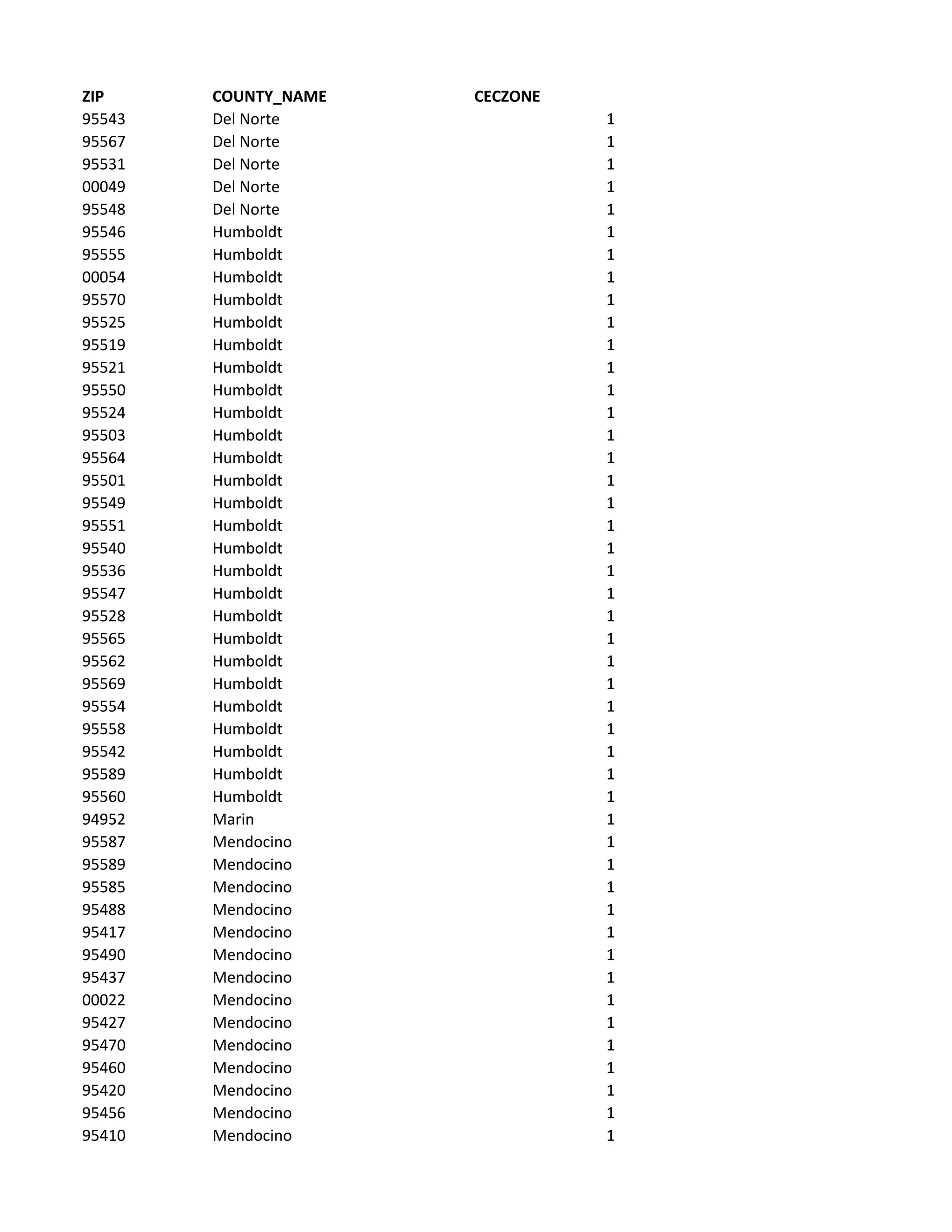 Este documento lista códigos postales y condados de California y asigna a cada uno una "zona de elección de la comisión de educación" o CECZONE. La mayoría de los códigos postales enumerados se encuentran en los condados de Del Norte, Humboldt, Mendocino, Sonoma, Lake, Marin, Napa y el norte de California y se les asigna la CECZONE 1. Otros códigos postales se enumeran en condados del centro y norte de California y se les asigna la CECZONE 2. Finalmente, una gran cantidad