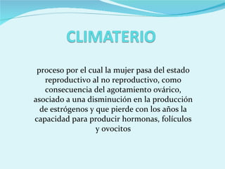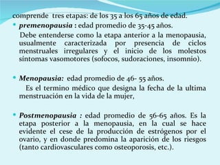 El documento describe el proceso de menopausia en mujeres, que incluye tres etapas (premenopausia, menopausia y postmenopausia) marcadas por la disminución de la producción de estrógenos y cambios en el ciclo menstrual. Explica los síntomas vasomotores, metabólicos y emocionales comunes, y recomienda terapia de reemplazo hormonal y estilos de vida saludables para prevenir problemas de salud asociados con la menopausia.