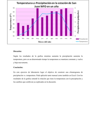Este documento describe cómo el autor creó un climatograma manualmente y en Excel usando datos de temperatura y precipitación de la estación San Juan WFO. El autor graficó los datos para mostrar la relación entre la temperatura y la precipitación a lo largo de los meses del año. El climatograma muestra que a medida que aumenta la precipitación también aumenta la temperatura, pero la temperatura se mantiene constante durante cierto tiempo antes de disminuir nuevamente.
