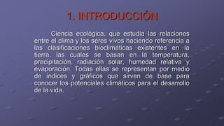 Este documento presenta una introducción a la bioclimatología. Explica que la bioclimatología estudia la relación entre el clima y los seres vivos, haciendo referencia a las clasificaciones bioclimáticas existentes en la Tierra basadas en elementos como la temperatura y la precipitación. Además, introduce algunos conceptos clave como los índices y diagramas climáticos y su utilidad para entender el potencial climático para el desarrollo de la vida.
