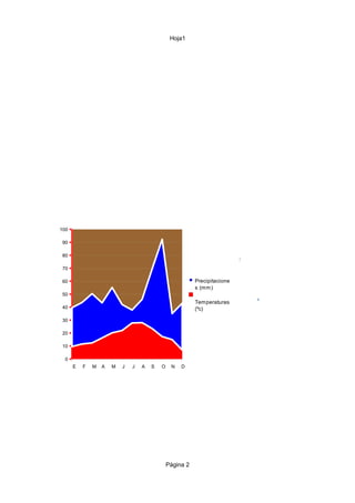 El documento presenta los datos meteorológicos de 12 meses, incluyendo las temperaturas promedio en grados Celsius y las precipitaciones en milímetros. Muestra estas cifras en una tabla y dos gráficos, uno de barras que compara las temperaturas y precipitaciones mes a mes, y otro de líneas que representa las variaciones a lo largo del año.