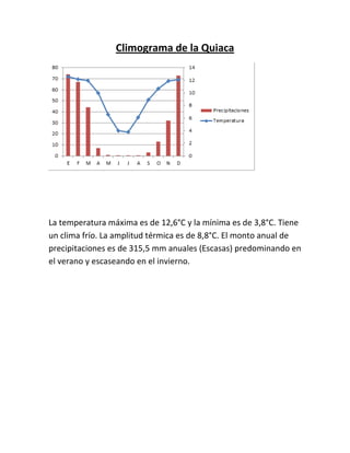 El documento presenta los climogramas de varias ciudades argentinas, describiendo para cada una la temperatura máxima y mínima, tipo de clima, amplitud térmica y precipitaciones anuales. Las ciudades analizadas son Ushuaia, Posadas, Buenos Aires, La Quiaca, Santa Rosa, Iguazú y La Rioja.