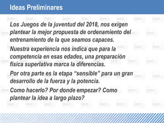 Este documento describe diferentes estrategias para planificar el entrenamiento de fuerza para el alto rendimiento a largo plazo. Propone una planificación por macrociclos que se enfocan en la consolidación de la base muscular, el aumento del reclutamiento muscular y la sincronización, y la fuerza específica. Dentro de cada macrociclo, existen diferentes estrategias como la variación de cargas simples, sistemas de variación de carga, y sistemas de máxima calidad para continuar mejorando la fuerza.