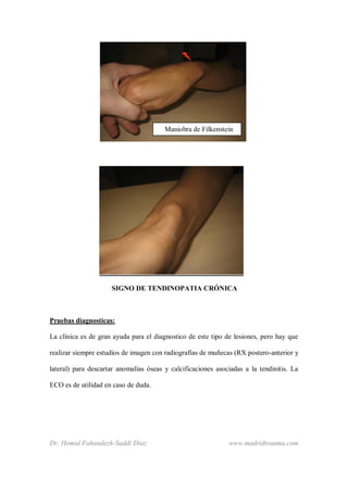 La enfermedad de De Quervain es la inflamación de la vaina de los tendones del pulgar que conectan el pulgar con la muñeca y causa dolor e hinchazón. Los síntomas incluyen dolor en la muñeca que empeora al mover el pulgar. El diagnóstico se basa en la exploración física y la maniobra de Finkelstein. El tratamiento conservador incluye antiinflamatorios, pero la cirugía puede ser necesaria para liberar los tendones si el dolor persiste.