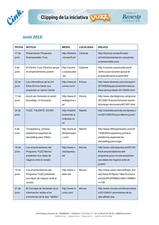Este documento presenta un reporte de las acciones realizadas e inserciones en medios por la compañía Cink Shaking Business SL entre junio y julio de 2013. Incluye tablas con el número de impactos mensuales y listas detalladas de noticias publicadas en varios medios sobre el programa Yuzz para emprendedores, incluyendo enlaces a cada artículo.
