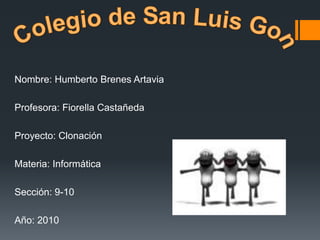 El documento presenta información sobre un proyecto de clonación. Explica que la clonación es el proceso de crear copias idénticas de un organismo ya desarrollado de forma asexual, y que la primera clonación exitosa de un mamífero fue Dolly la oveja en 1997. También describe los diferentes tipos de clonación y algunos de los desafíos y problemas éticos relacionados con la clonación.