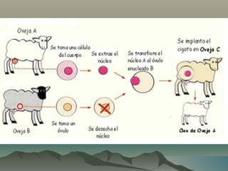 Este documento proporciona definiciones y explicaciones sobre varios temas relacionados con la clonación. Explica que la clonación es la reproducción asexual de organismos genéticamente idénticos, ya sea de forma natural o artificial. Describe los dos métodos principales de clonación, así como los tipos de clonación como la molecular, celular, de organismos de forma natural y artificial. También discute brevemente sobre Dolly, la primera oveja clonada, y los pros y contras de la clonación.