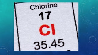El químico Carl Wilhelm Scheele descubrió el cloro en 1774. En 1810, Sir Humphry Davy nombró al elemento como "cloro", que proviene del griego y significa "amarillo verdoso". El cloro es un gas halógeno ubicado en el grupo 17 de la tabla periódica. No se encuentra libre en la naturaleza, sino combinado con sodio en sales como la carnalita y la silvinita. El cloro se utiliza ampliamente en la producción de agua potable y papel, así como en la desinfección