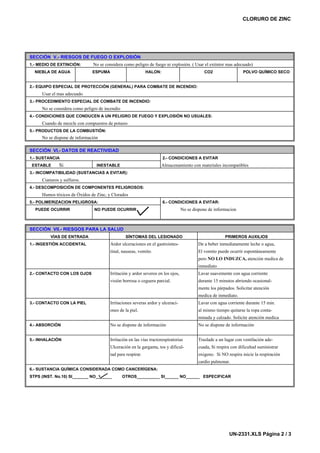 Este documento presenta una hoja de datos de seguridad para el cloruro de zinc. Proporciona información sobre sus propiedades físicas y químicas, riesgos para la salud y el medio ambiente, equipo de protección personal recomendado, precauciones para el manejo y almacenamiento, así como indicaciones en caso de derrames o fugas. El cloruro de zinc es un sólido cristalino, blanco e inodoro que puede causar irritación severa en piel, ojos y vías respiratorias. Se recomi