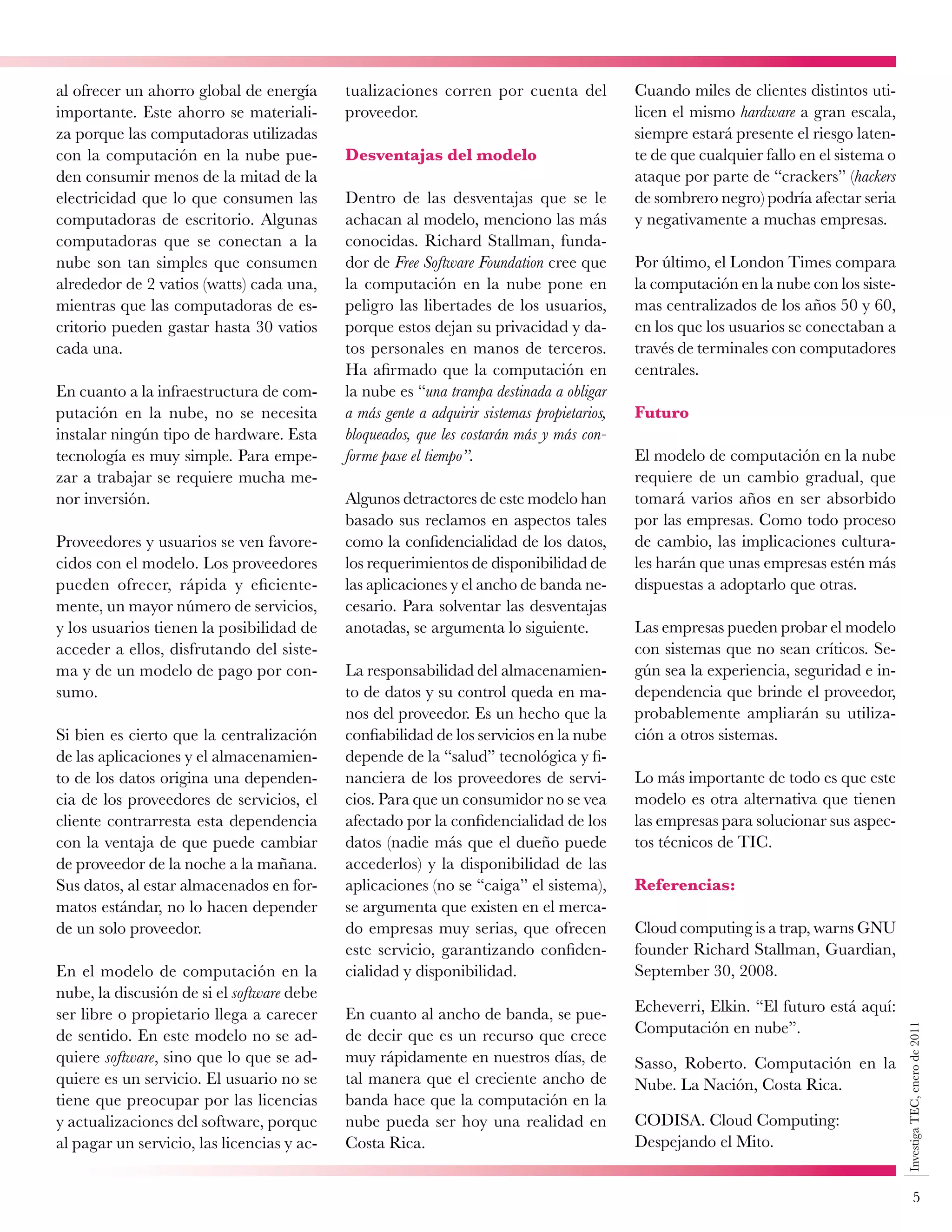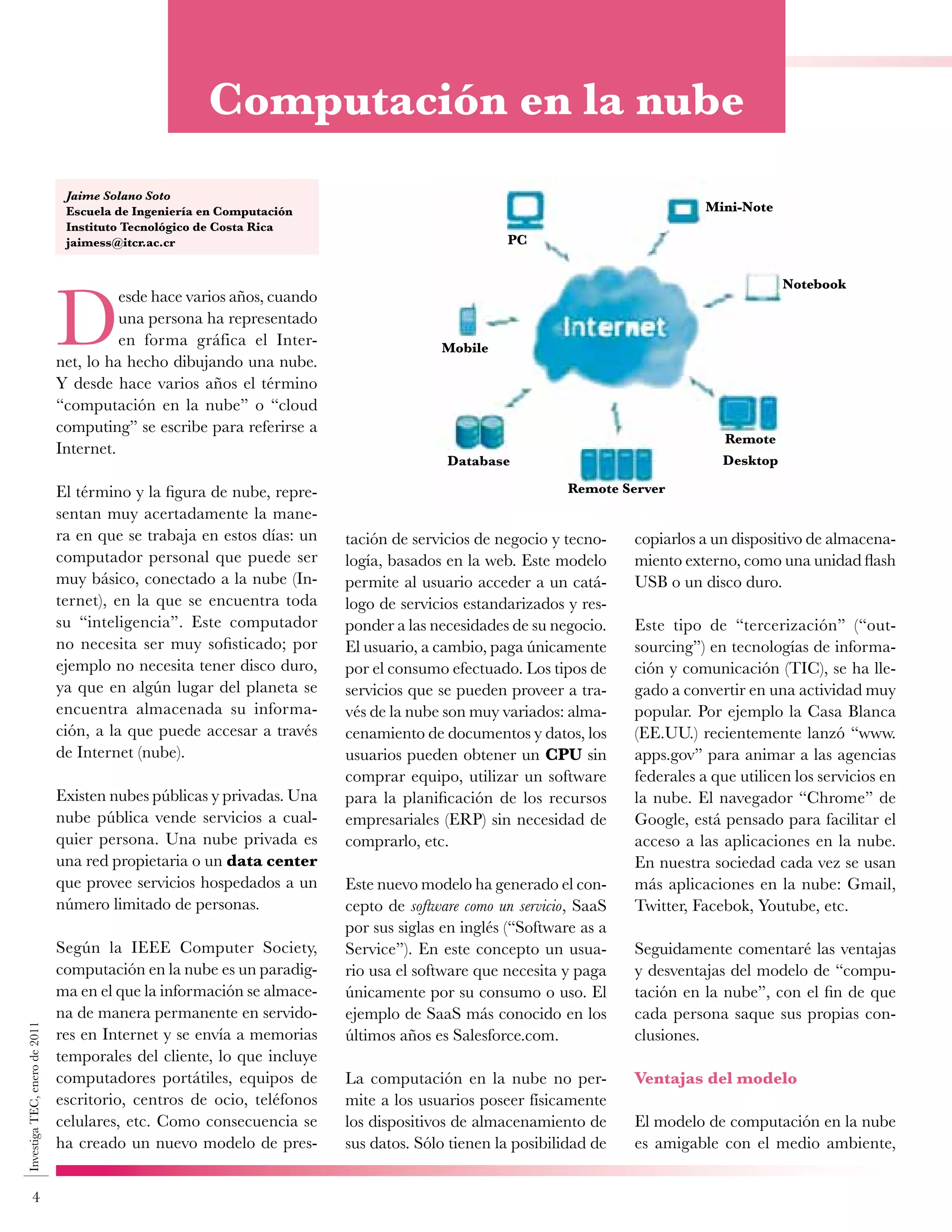 El documento describe la computación en la nube, donde la información se almacena en servidores en Internet y se envía a dispositivos del cliente cuando es necesario. Esto permite que los clientes accedan a servicios a través de la web sin necesidad de software o hardware local. La computación en la nube ofrece ventajas como ahorro de energía y baja inversión inicial, pero también plantea desafíos como la privacidad de datos y dependencia de proveedores.