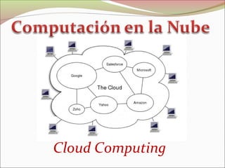 El documento describe el concepto de computación en la nube, incluyendo sus beneficios como la flexibilidad, escalabilidad elástica y menor inversión en infraestructura. Explica algunos servicios populares en la nube como Dropbox, Evernote y Spotify. También analiza proveedores de servicios en la nube como Google Apps, Amazon EC2 y Windows Azure.