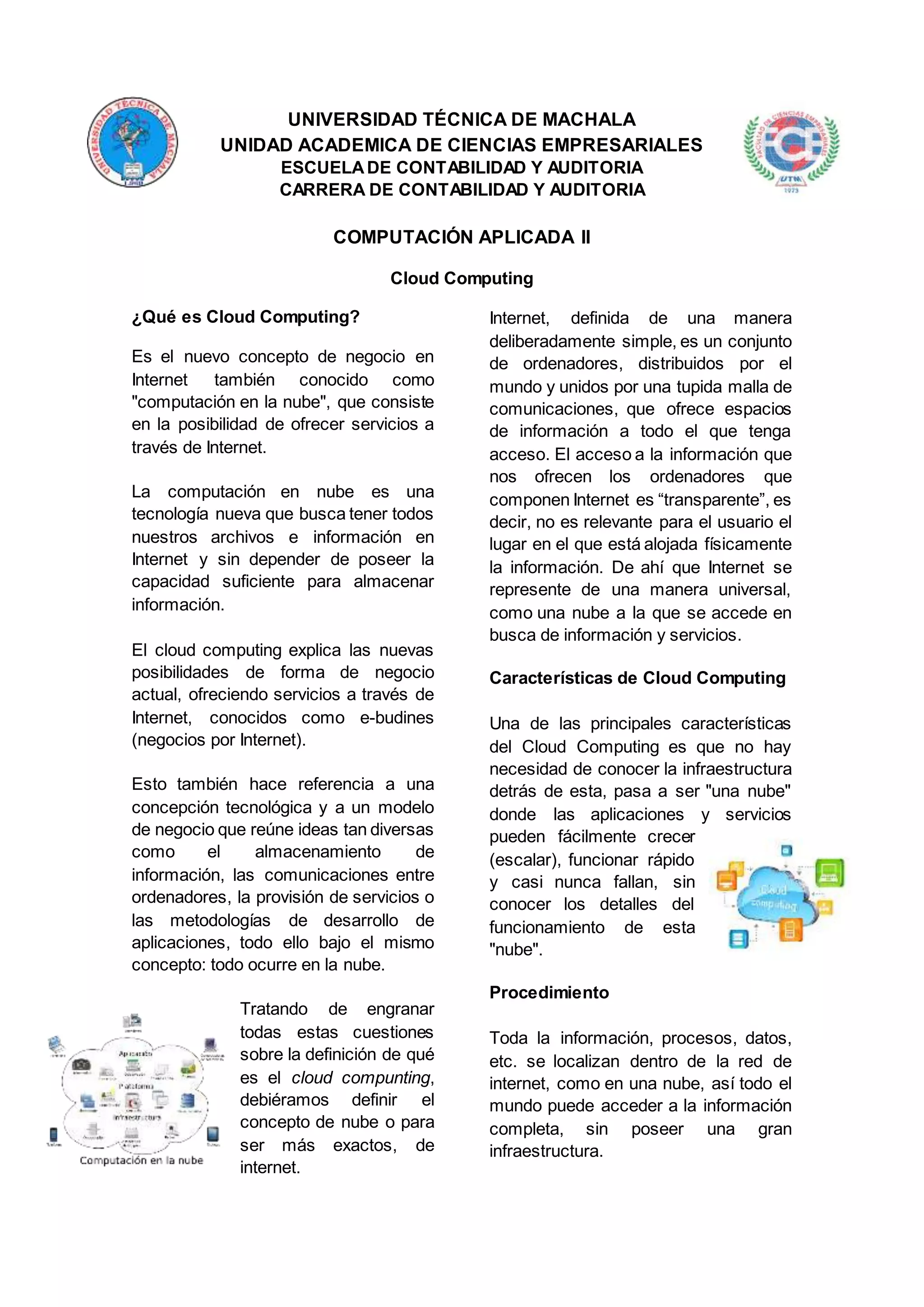 Cloud computing permite a los usuarios acceder a servicios y aplicaciones a través de Internet utilizando solo un navegador. Esto incluye almacenamiento de datos, correo electrónico, blogs y antivirus. La computación en la nube ofrece ventajas como acceso a la información desde cualquier lugar, escalabilidad y bajo costo, pero también plantea riesgos como la pérdida de privacidad y dependencia de servicios en línea. El cloud computing se define como un modelo de servicios escalables que asigna y consume recursos de computación de forma dinámica a