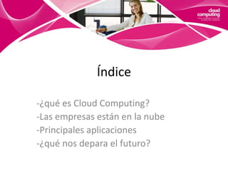 El documento describe el concepto de Cloud Computing, incluyendo su definición, ventajas y desventajas. Explica los tres tipos principales de servicios en la nube (SaaS, PaaS e IaaS) y algunas de las aplicaciones más comunes como correo web, almacenamiento remoto y trabajo a distancia. Finalmente, predice que el uso de aplicaciones basadas en la nube aumentará significativamente en el futuro a medida que la conectividad mejore y más servicios e información personal se almacenen en la nube.