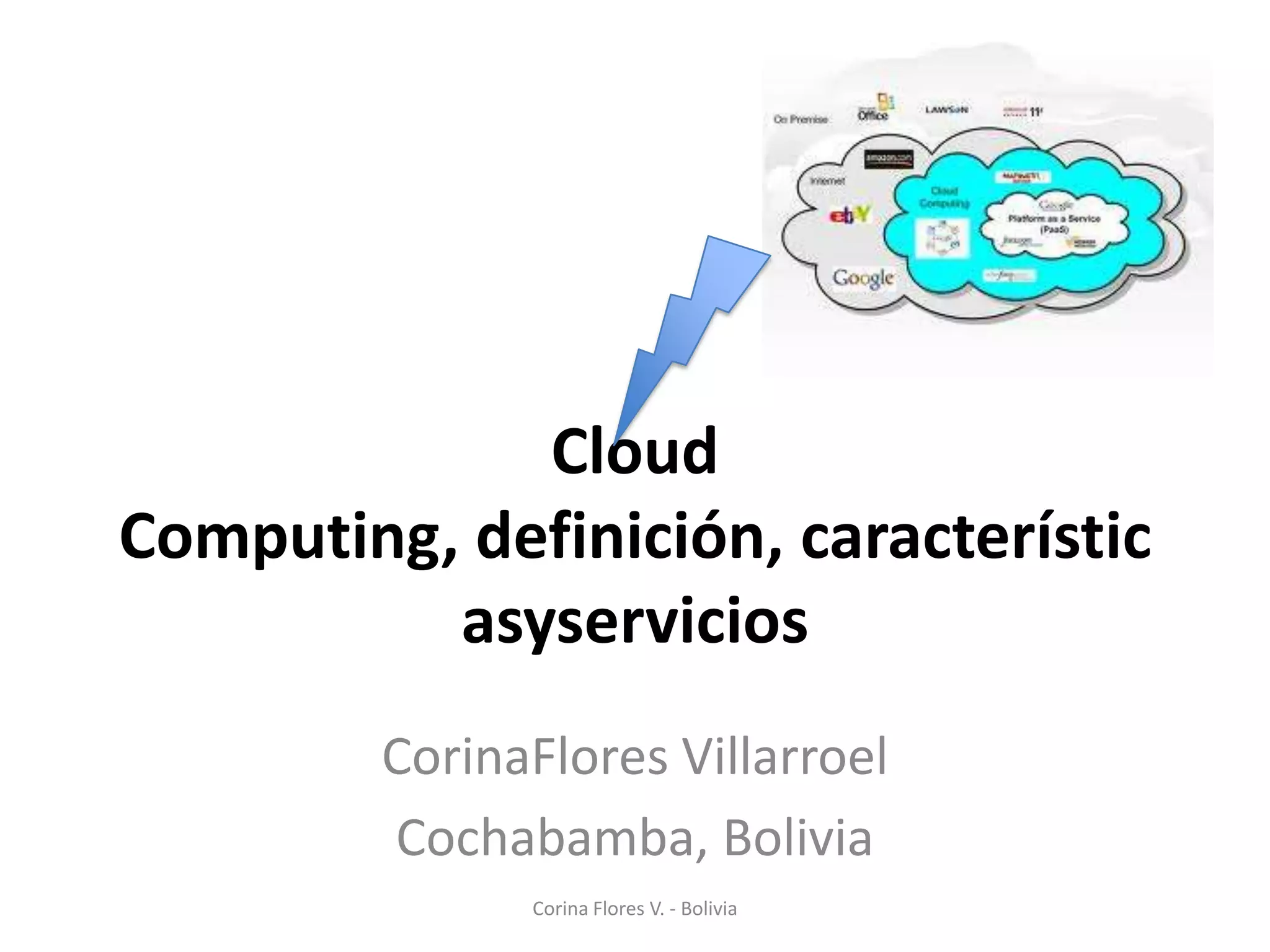 El documento define la computación en la nube y describe sus características y tipos de servicios principales como plataformas como servicio, infraestructura como servicio y software como servicio. Explica ejemplos populares como Google Apps, Dropbox, iCloud y Skydrive. Finalmente, discute perspectivas sobre el futuro de la computación en la nube y la privacidad de datos.
