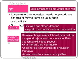 El documento habla sobre la nube o cloud computing, que permite acceder a la información almacenada en línea de forma privada desde cualquier dispositivo a través de servicios como DropBox y Evernote. También menciona el webstoring como almacenamiento virtual gratuito e ilimitado para compartir archivos, y los portales como herramientas online interactivas para el aprendizaje que deben tener una interfaz clara y evaluaciones formativas. Finalmente, distingue entre página web como documento individual y sitio web como conjunto de páginas bajo un mismo domin