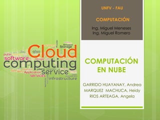 1) La computación en la nube es un modelo de entrega de servicios a través de Internet que ofrece recursos de forma elástica y bajo demanda. 2) Presenta varios modelos de implementación como nube pública, privada e híbrida. 3) Entre los riesgos se encuentran problemas de privacidad, seguridad, disponibilidad y portabilidad de datos.